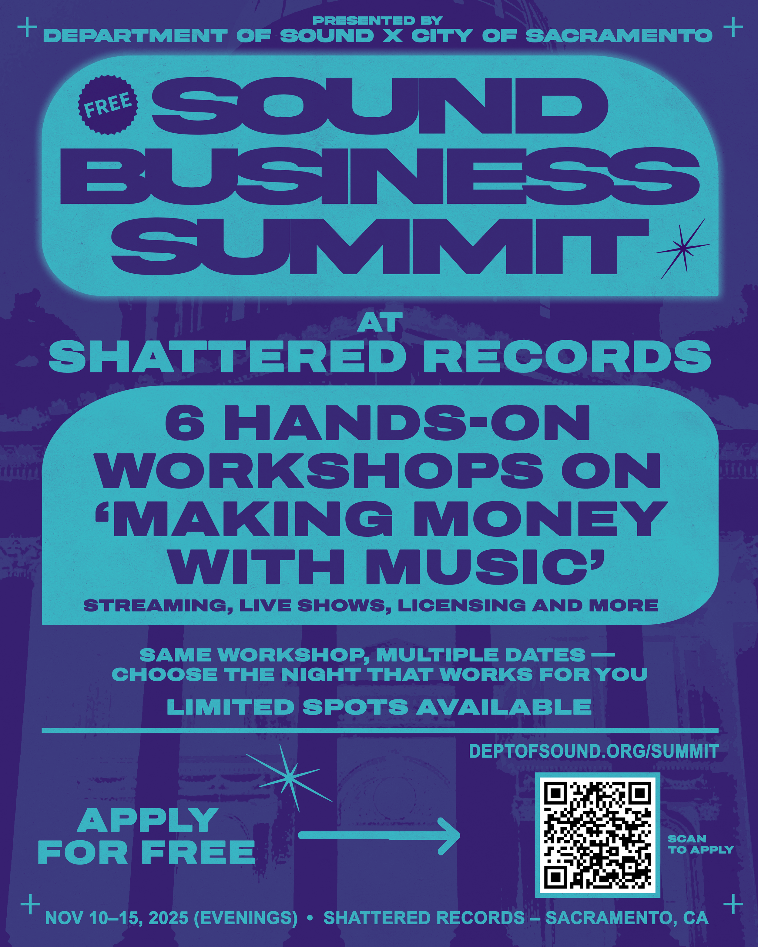 Attendees must currently reside in the City of Sacramento. Attendees who meet the required fields on the application will be selected by lottery. The workshop is identical on multiple dates—choose all dates you can attend. It’s FREE and held at Shattered Records in Sacramento.